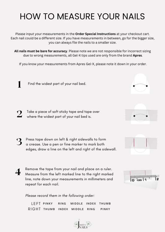 All sets featured here are ready to ship, pre-made with Apres Gel-X tips only, please expect up to 1 business day for processing time before shipping out. Please use the tape method (instructions listed on each product's photos) to check if your nail sizes match what's listed, nail sizes listed in millimetres.